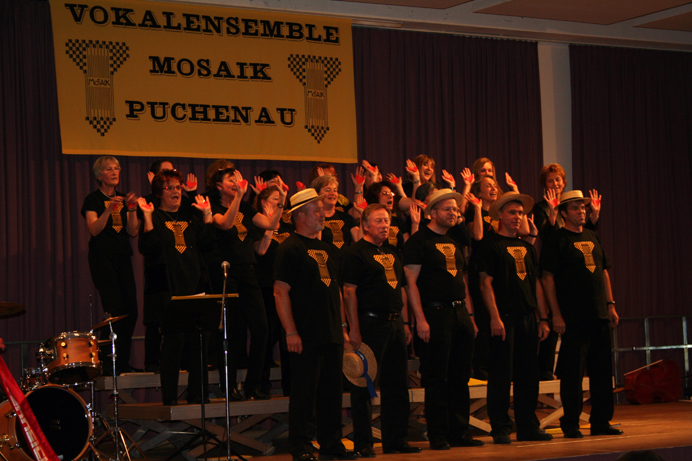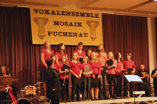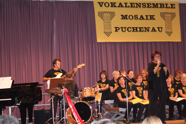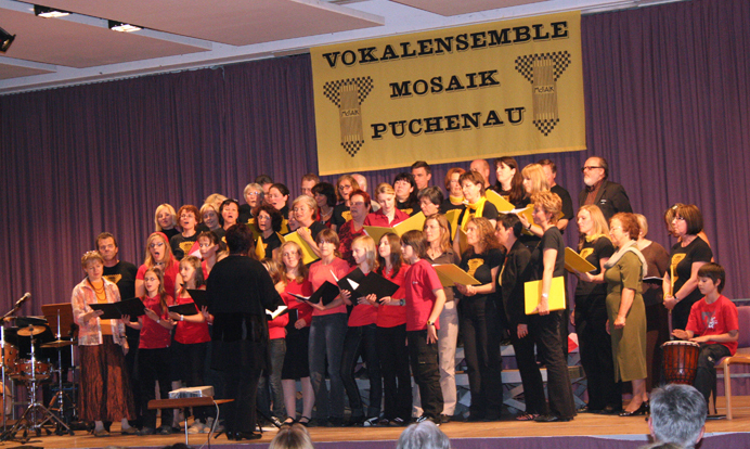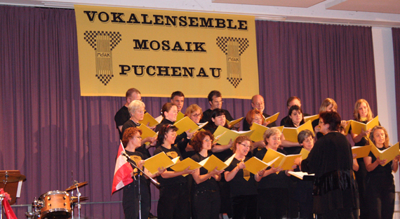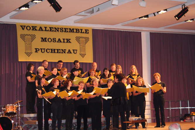 25 Jahre Vokalensemble MOSAIK 1983 - 2008 (Durch Klicken auf ein Bild erhält man die große Version) Probenwochenende Juni 2008 in Bad Ischl Vor unserem Konzert probten wir noch zwei Tage intensiv, diesmal im Jugendgästehaus Bad Ischl. Das dort vorhandene Piano hat uns das Proben ermöglicht, auch wenn es nicht perfekt gestimmt war. Chorkonzert 25 Jahre MOSAIK Bei einem Jubiläumsempfang vor dem Konzert am 13. Juni 2008 verlieh Bürgermeister Wolfgang Haderer Andrea Engelberger für ihr ehrenamtliches Engagement und die aktive Gestaltung des Puchenauer Vereinslebens die Ehrennadel der Gemeinde Puchenau. Anschließend begeisterten das Vokalensemble MOSAIK und das Jugendensemble YoungStars mit einem bunten Programm, in dem nicht nur Stimmen, sondern auch einige Instrumente zu hören waren, die Zuhörer im gut gefüllten Buchensaal.