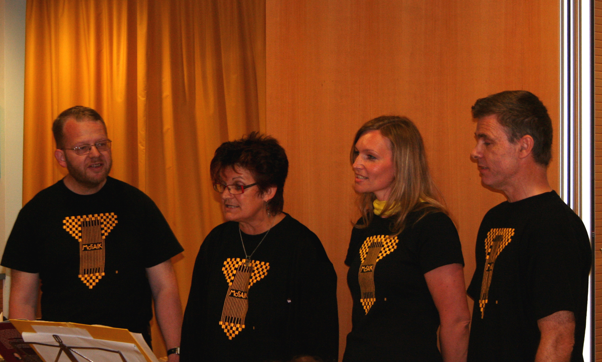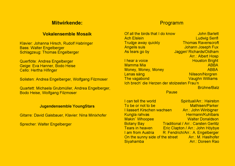 Zum Anhören bitte hier klicken: Thomas Ravenscroft (1562-1635): Trudge Away Quickly John Bartlet (um 1610): Of all the birds that I do know MOSAIK-Quartett: Bodo Heise, Andrea Engelberger, Michaela Grubmüller, Wolfgang Filzmoser Quartett hören: Johann Joseph Fux (1660-1741): Angelis suis In Erinnerung an unsere ersten Konzerte gab es diesmal wieder eine Showeinlage. Die Fußballinteressierten unter den Zuhörern wurden mit einem Zwischenstand des Spiels Niederlande-Frankreich versorgt. Die Zugabe sangen wir alle gemeinsam: Ehemalige, MOSAIK und YoungStars.